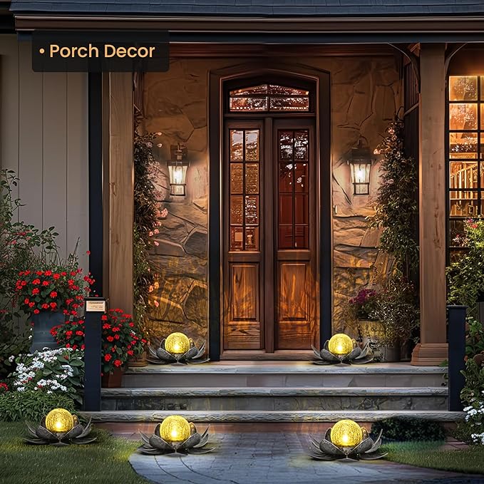 • ☔️【Weatherproof Material】☔️This outdoor solar lotus light with metal petals and crackle glass ball is made of sturdy metal with UV-resistant paint, which makes it possible to keep long-lasting performance in most weather conditions, including sunny days, rainy nights, and light snowy days.