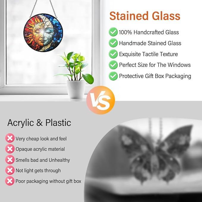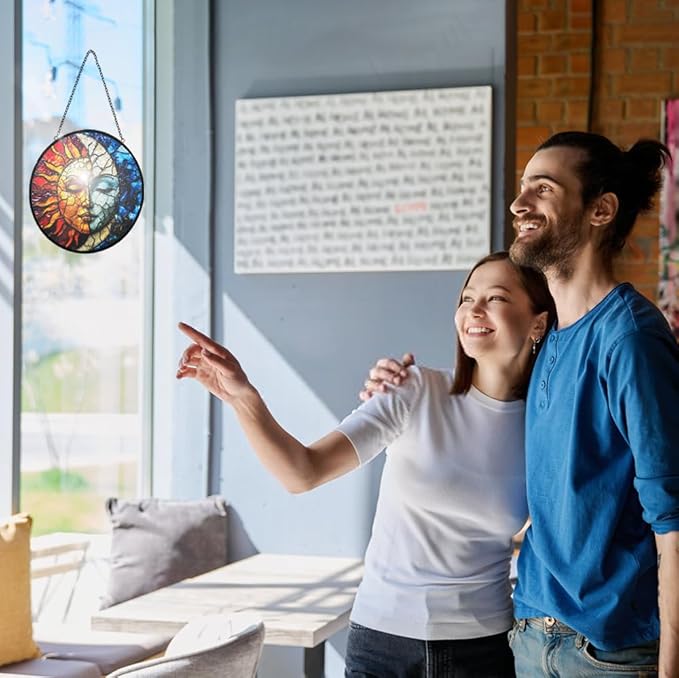 • 【Easy Installation Home Decor】The suncatcher stained glass is suitable for hanging on windows, walls, or anywhere you desire. It comes with an a metal chain for quick and easy hanging. With the metal chain, it is even more convenient to place it wherever you want, so you can effortlessly enjoy the beauty of your moon and sun stained glass window hanging.