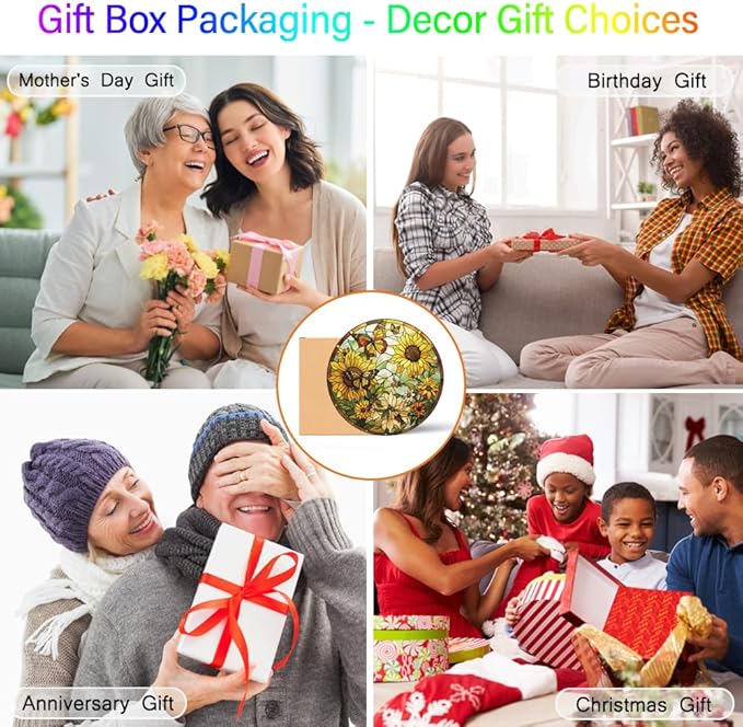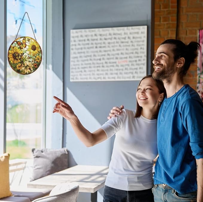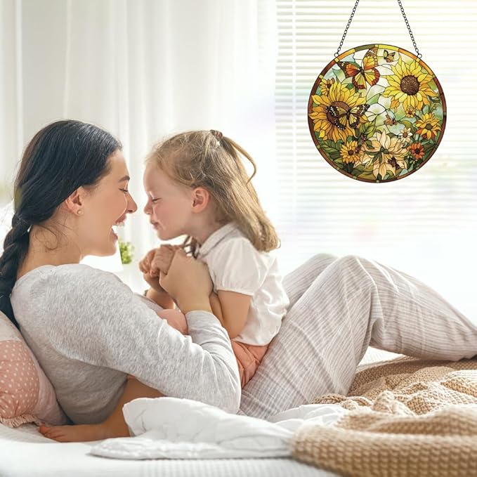 • 【Exquisite Festival Gift Ornaments】The handmade suncatcher for hanging stained glass is a lovely gift for your mother, daughter, friends, sister or sunflower lover, can be decor glass doors, kitchen window, upstairs window, round top window, front window, bedroom window, kitchen door, our sunflower wall art decor would be a great embellishment to your home. Suitable for Mother's Day gifts, christmas gifts, thanksgiving gifts, birthday gifts, friendsgiving gifts.