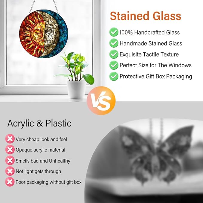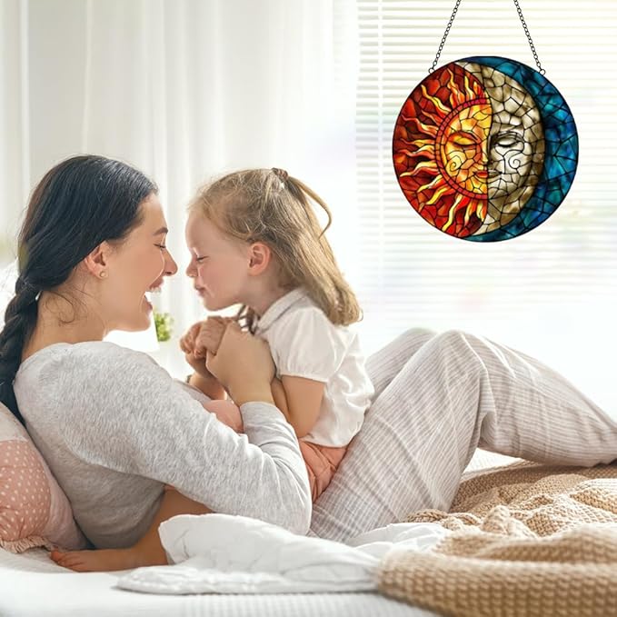• 【Exquisite Festival Gift Memorial】The handmade suncatcher for hanging stained glass is a lovely gift for your mother, daughter, friends, family, lover or nature enthusiast, can be decor glass doors, kitchen windows, upstairs windows, round top windows, front windows, bedroom windows, kitchen doors, our sun and moon room decor panel would be a great embellishment to your home. Suitable for Mother's Day gifts, Christmas gifts, Thanksgiving Day gifts, Birthday gifts, Friendsgiving gifts.