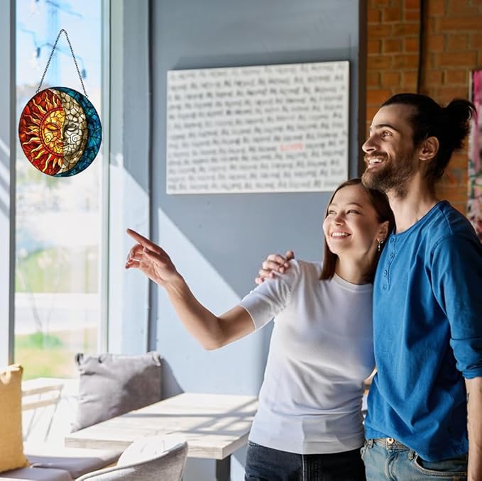 • 【Easy Installation Home Decor】The suncatcher stained glass is suitable for hanging on windows, walls, or anywhere you desire. It comes with an a metal chain for quick and easy hanging. With the metal chain, it is even more convenient to place it wherever you want, so you can effortlessly enjoy the beauty of your sun and moon stained glass window hanging.