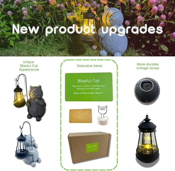 • 【Product Upgrades】The Blissful Cat sculpture, now pending a design patent, includes a unique cat cardholder, greeting card, and a blank card for your own messages. Upgrade the product packaging by using Tuck Top Gift Boxes, and include raffia grass for decor. Upgraded the cat solar lights durability with more efficient solar panels and moved the switch to the bottom to improve outdoor garden sculpture waterproof performance