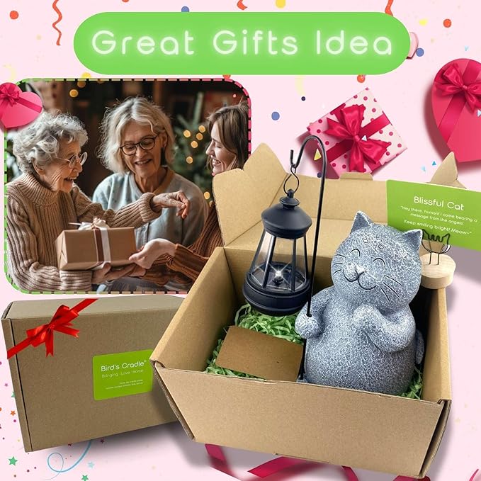 BIRD'S CRADLE Blissful Cat Solar Garden Statue - Outdoor Art Decor, Cat Lovers Themed Gift, Unique Patio, Balcony, Yard, Birthday, Housewarming Gardening Figurine Gifts for Mom, Grandma, Wife, Women