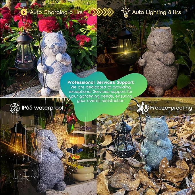 • 【Easy to Use and Weather-Resistant】To use the lantern for the first time, set the bottom switch to the 'on' position. The solar-powered panel will fully charge in 6-8 hours of daylight and provide automatic illumination for 8-10 hours at night. The cat figure is made of resin with a hand-painted faux stone finish and coated with UV protection for outdoor use. It has an IP65 waterproof rating, ensuring it is protected from rain and snow