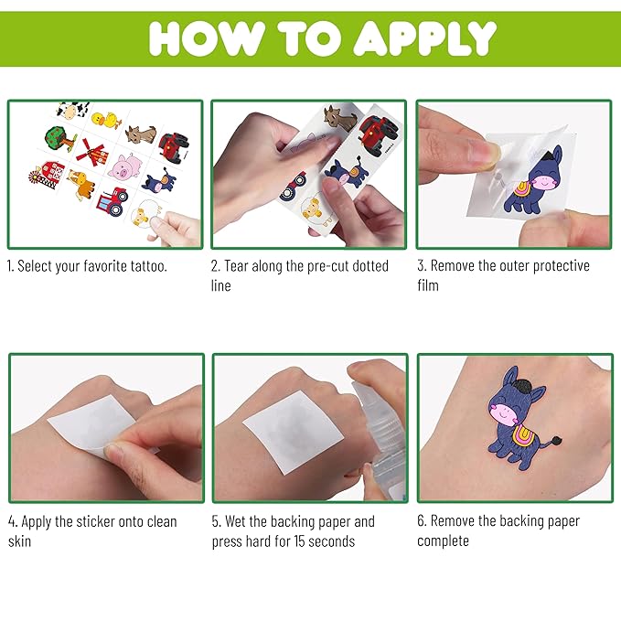 • 🐄TATTOOS FOR FARM BARNYARD ANIMAL THEMED DECORATION: FARM DIE-CUT TATTOOS for people who love farm, farmhouse , Animal. Featuring 6 sheets with 72 pcs of lovely, fun and colorful design: Cow, pig, horse, tractor... Each sheet measures 6.3 * 4.7 inches. You can temporarily tattoo them on your body or objects such as phones, bottles, laptop…