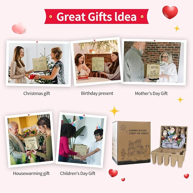 • Unique design: The vivid details of this solar garden statue depict these scenes of happy life,Three gnomes are having a party on a turtle, one playing guitar, one drinking, and one sleeping. The turtle slowly brought them home. making it a beautiful and lovely solar garden statue. Dimensions of 11.81X9.05X8.66 inches.