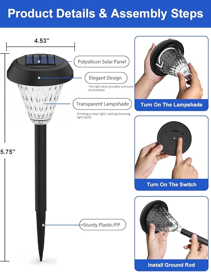 • Easy and Quick Installation:With our simple assembly process, you can easily install the outdoor solar lights in just a few minutes. If the soil is too hard, simply moisten it or dig a small hole before installation. It's that easy!