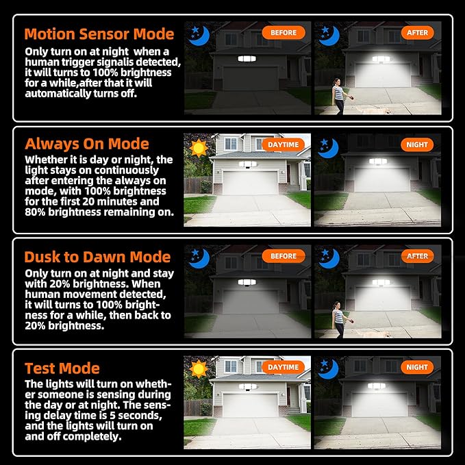 • 【4-IN-1 SMART LIGHTING CONTROL】: Choose from Always-On, Dusk to Dawn Outdoor Lighting, Motion-Activated (6-12m range), or Custom Timer modes. The Intelligent Motion Sensing Design automatically extends lighting during continuous movement, while the photocell mode ensures lights only activate in darkness – ideal for Garage Motion Sensor Lighting and Yard Security Flood Lights.