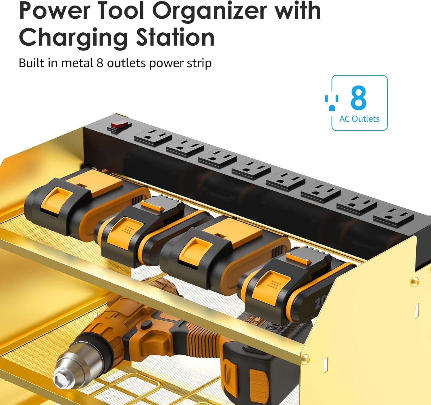 • Special customized glossy gold color power tool organizer with charging station, come with 8 outlets. If you have a lot of rechargeable tools, you can charge everything right in the rack and avoid searching for sockets. 6ft power cord included.