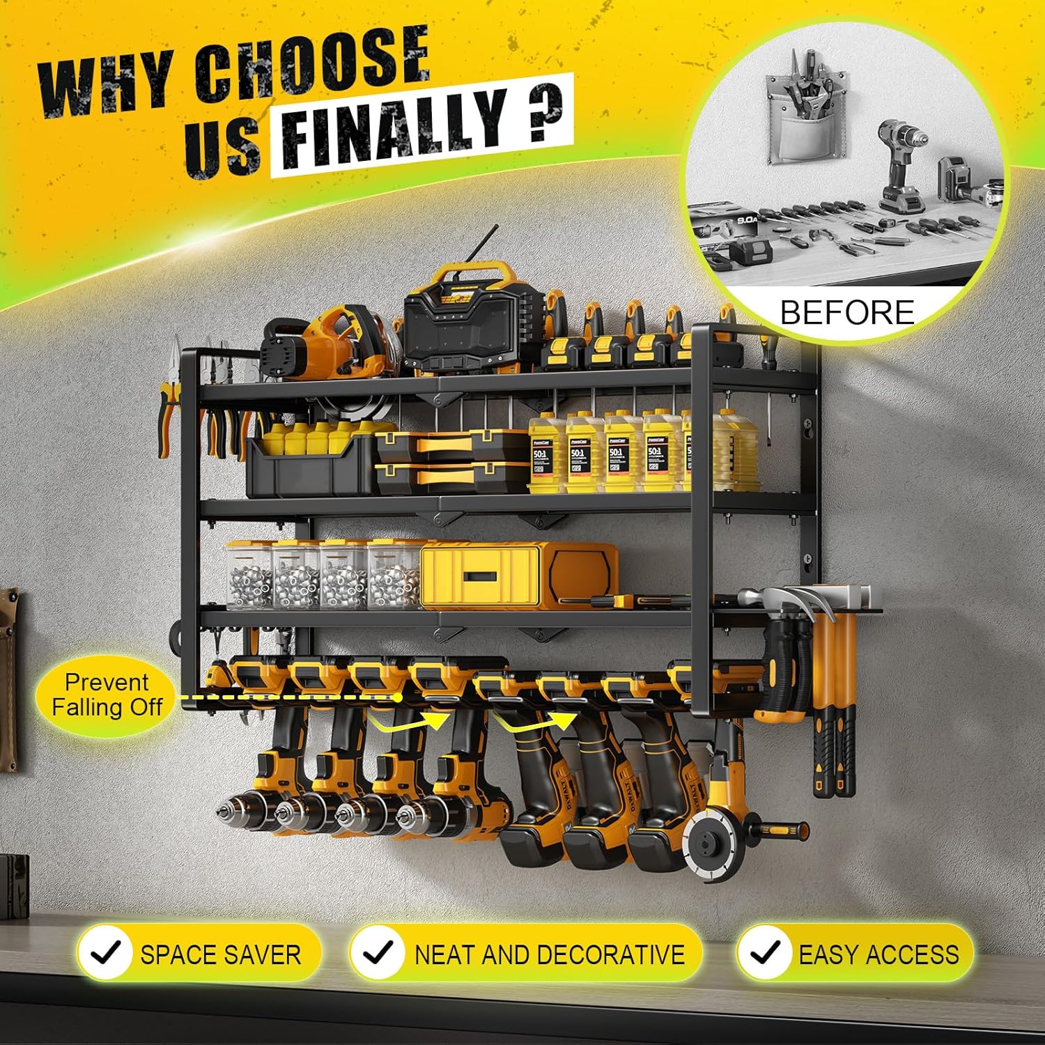 • Heavy Duty Steel Construction: The power tool organizer is constructed from a high quality powder-coated alloy steel, Its sleek black finish prevents scratching, that is rust-resistant, corrosion-resistant, and scratch-resistant.