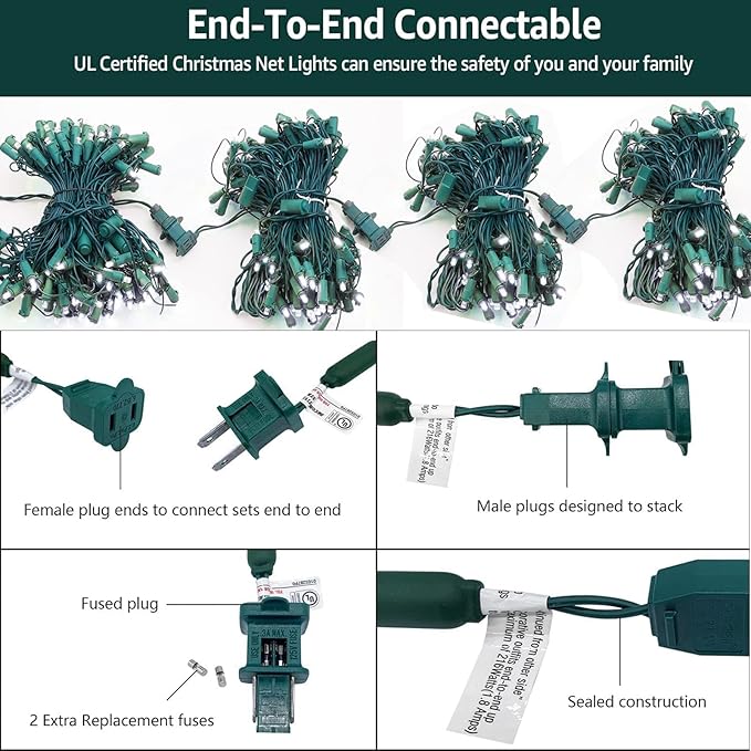 • 【UL Certified Net Christmas Lights】: Our outdoor christmas net lights Strictly tested and meets the US requirements of string lights UL safety standards.Not only christmas net lights has passed the UL certification as a whole, but its raw materials and accessories (such as wires and plugs) are all UL-certified products. High quality certified products ensure the safety of you and your family. Won't over heat even used for a long time.It has approved for indoor and outdoor christmas decorations.