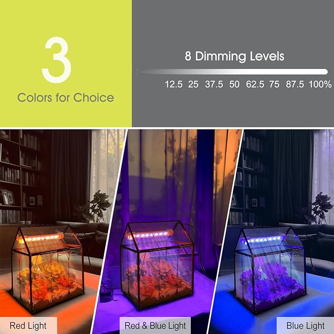 • Plant Terrarium Kit with Grow Light: With 5W grow light (5V Low Safe Voltage) equipped with 8 Red and 8 Blue LEDs, greatly promotes indoor growth as it accelerates photosynthesis, especially when the plant needs extra light when raining,snowing,dark indoor and so on, will give your plants considerate care (notice: without plants)
