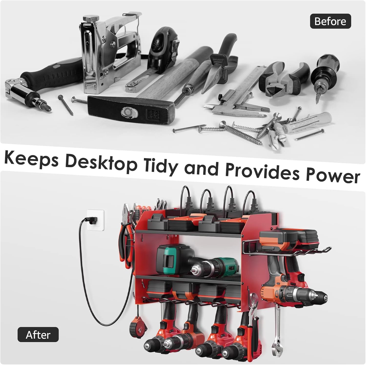 CCCEI Modular Power Tool Organizer Wall Mount Charging Station, Red 6 Drills Holder with 8 Plug Power Strip 10FT, Garage Drill Battery Heavy Duty Metal Shelf, Utility Rack with Hooks, Side Storage.