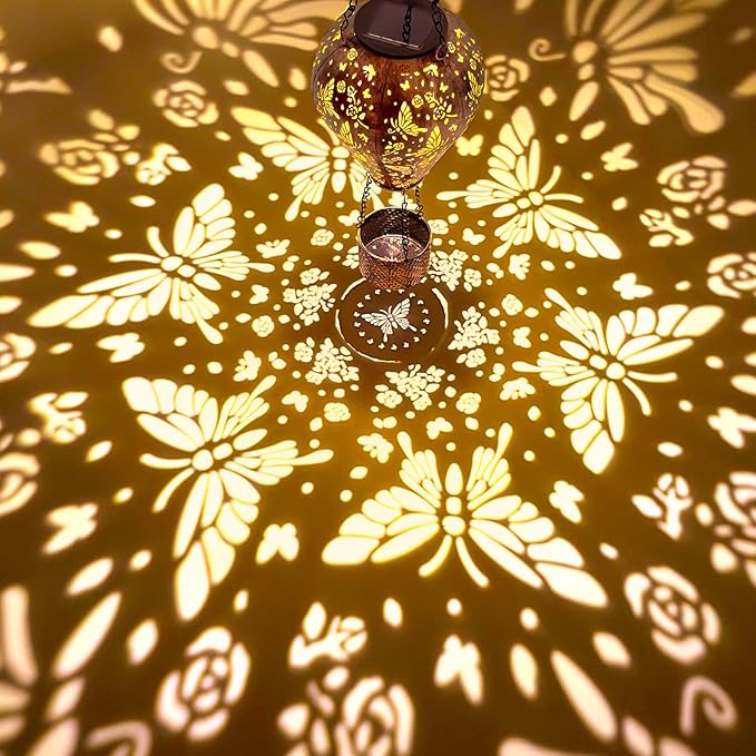 • 【Butterfly Pattern】The Profinella hot air balloon solar lantern features a unique metal butterfly cut-out pattern design. During the day, it serves as an art ornament to enhance your garden, yard or outdoor space; at night, it transforms into a magical light show, projecting clear butterfly patterns onto the ground or walls, adding endless charm to your outdoor decor.