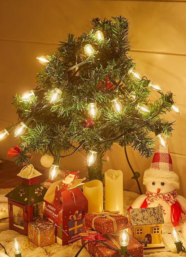 • C7 Clear LED Christmas String Lights Outdoor, 100FT Connectable Christmas Lights with 104 0.6W Bulbs(4 Spare), Vintage Hanging Lights for Xmas Holiday Party Patio Roofline House Decor, warm white light emanates from the bulbs to create a retro and cheerful atmosphere, and it doesn't affect the other bulbs to light up if one bulb doesn't light up