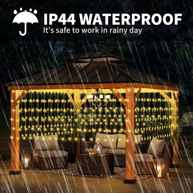 32.8 * 3.28FT Large Size Solar Curtain Lights Outdoor, 8 Modes Icicle Lights, Garden Christmas Decortions for Patio, Gazebo, Eaves, Fence, Tree, Porch (Warm White)