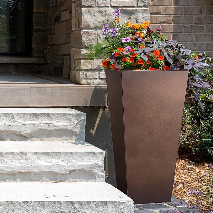 KOL 25''H. Tall Galvanized Steel Planter with Saucer, Set of 2, Planter Pots with Drainage Hole for Indoor & Outdoor Use, Decorative Flower Plant Pots for Front Porch, Patio, Deck - Rust Color