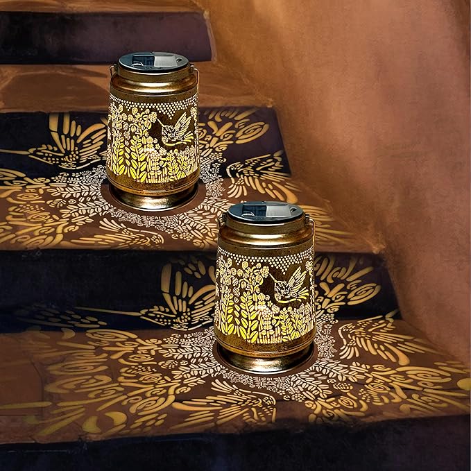 • [Perfect Garden Decorative]: Hummingbird solar lanterns outdoor camping waterproof lights adopts hollow out design and monarch butterfly pattern,with Bronze Color and hollow out metal veneer, the solar outdoor lanterns casts bright and warm light in darkness, Solar lanterns could project beautiful patterns, creating a gorgeous and warm atmosphere. Perfect for decorations for garden,patio,lawn,backyards,yard, porch, pathway, walkway, terrace, balcony , twinkling tree, placed on the tabletop or on the ground and many other scenes.When lit at night, adding a touch of color to your garden.Size:6.00"H x 4.5"W x 4.5"L.