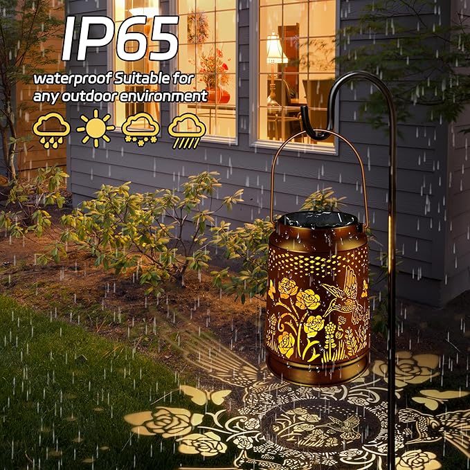 • [Enchanting Vintage Design] Antique bronze hummingbird solar lantern features laser-cut rose hummingbird & butterfly motifs, casting mesmerizing shadow patterns when illuminated. The retro copper finish blends Victorian elegance with modern solar tech, perfect for garden/patio ambiance.