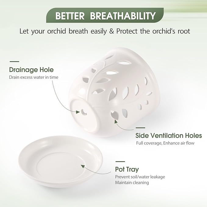 • Optimal Airflow Design: This orchid pot with holes features strategically placed side ventilation holes to promote air circulation, ensuring plants thrive and flourish. The bottom drainage holes effectively remove excess moisture, maintaining an ideal root environment for healthy growth. Each orchid pot comes with a matching water tray for a clean and tidy setup
