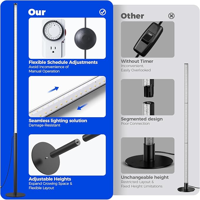 • Adjustable Height for Flexible Lighting : Experience the versatility of our upgraded vertical grow light. With an adjustable height range of 4ft-5.6ft, it caters to tall plants and large plant shelves, ensuring optimal illumination
