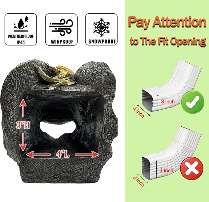 • Pay Attention The Fit Opening of Downspout Extender Decor: The vivid animal decor gutter downspout is fitting rectangular downspout opening up to 3"in Hx 4"in L.Simply connect the downspout,the extension splash block will fit your garden downspout tightly and perform nicely.