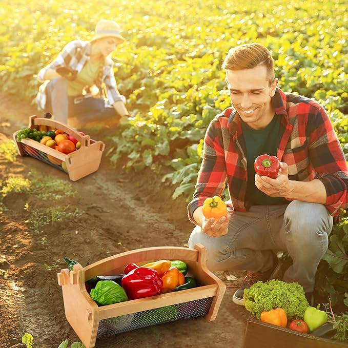 • Sturdy Construction: the garden hod harvest basket crafted from robust pine wood and rustproofed mesh wire bottom, exemplifies durability and longevity, ensuring it can withstand the weight of harvested produce and the rigors of agricultural use; Manually handcrafted to refine a smooth finished that boosts its natural appeal. Designed with quality in mind, the baskets are large and sturdy