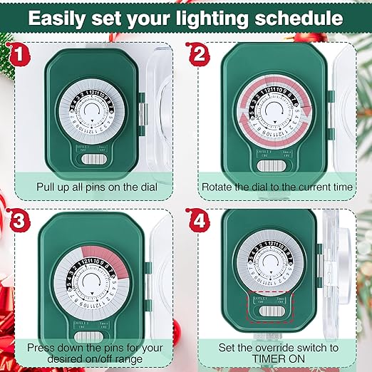 • Programmable Mechanical Timer: The built in mechanical timer is programmable in 30 minute intervals with 48 setting options over a 24 hour period, allowing you to customize your power schedule with ease. To set, rotate the dial until the pointer aligns with the current time, press down or pull up the pins for the desired on/off period, and switch to TIMER ON. The timer repeats the schedule daily, eliminating the need for manual operation