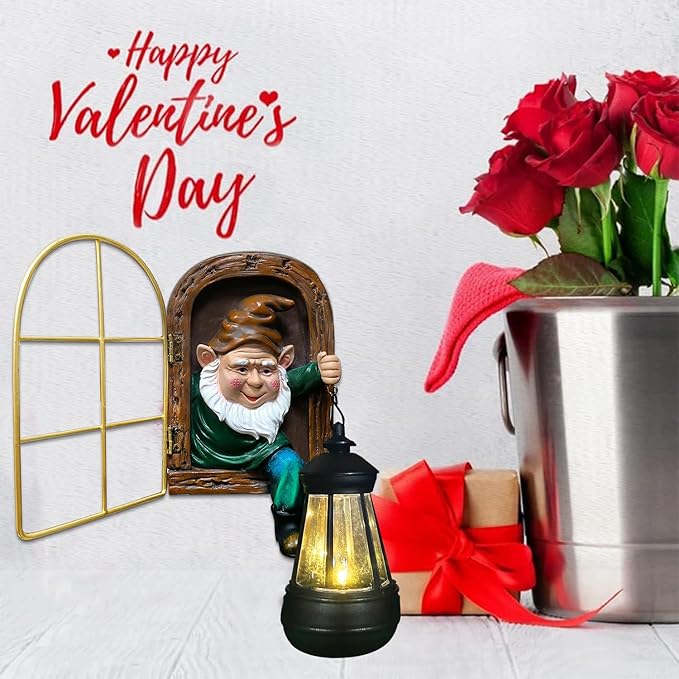• 【Easily Assemble Whimsical Tree Decor】 - This tree faces decor outdoor is depicted as if the curious little old man with white beards is climbing out of a window to see something interesting, holding a small shining solar lantern. You can hang this gnome garden decor on your favorite tree, wall or fence with 3 keyhole brackets on the back and 3 screws provided to ensure it stay securely in place. The swinging window and soft lighting effect bring you a visual appeal and realism.