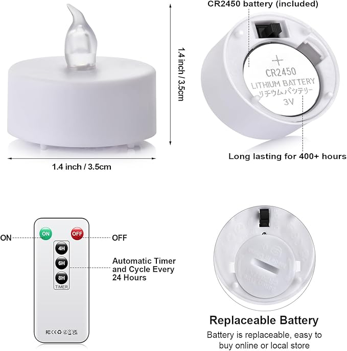• 1.PACKAGE Includes: 5pcs (D1.4*1.4 inch flameless) Flameless tea lights candles 1 remote control , Each tea light includes a CR2450 battery