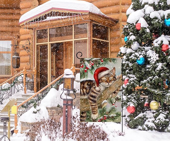 BLKWHT Winter Cat Garden Flag 12x18 Vertical Double Sided Christmas Holiday Outside Decorations Burlap Yard Flag BW738