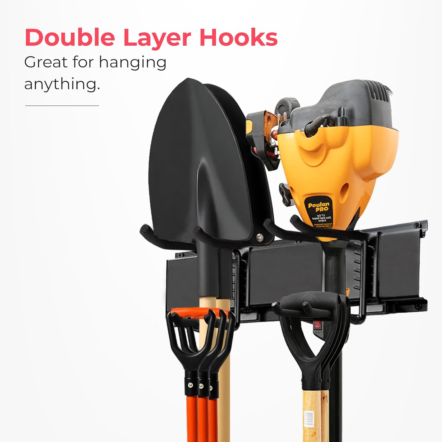 • DOUBLE-LAYER HOOK DESIGN FOR MAXIMUM STORAGE: Elevate your organization game with this innovative double-layer hook system! Perfect for securely holding shovels, rakes, power tools, hoses, and even sports equipment, giving you twice the capacity in the same space.