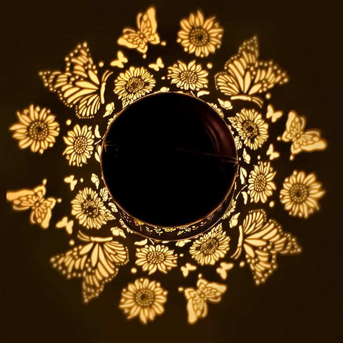 • Stylish Pattern Design: Our outdoor solar lanterns feature stylish and beautiful butterfly and sunflower patterns. Whether you hang the lantern on a tree or place it on a flat surface, it will cast charming patterns around. The unique patterns bring a breath of nature to your outdoor space, making it more inviting and visually appealing.There is the switch ON/OFF on the lantern cover, please make sure to Press the Button before charging.