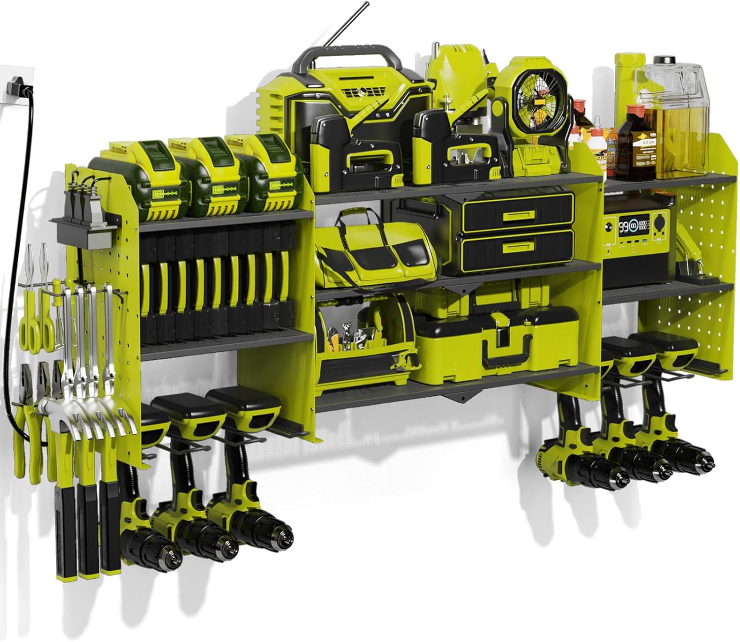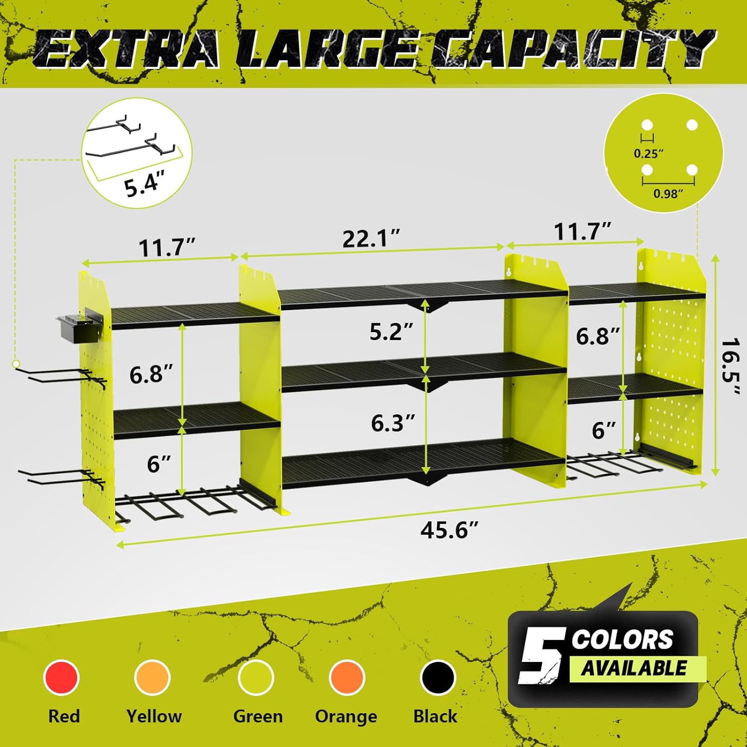 • Expanded Width to Maximized Storage: The Xankzi power tool organizer wall mount with charging station features a patented wide design in its 2 central shelves, perfect for storing more tools, especially longer items like chainsaws. Measuring 45.6" wide, 16.5" high, and 8.7" deep, this sturdy and space-efficient power tool storage rack keeps your tools organized