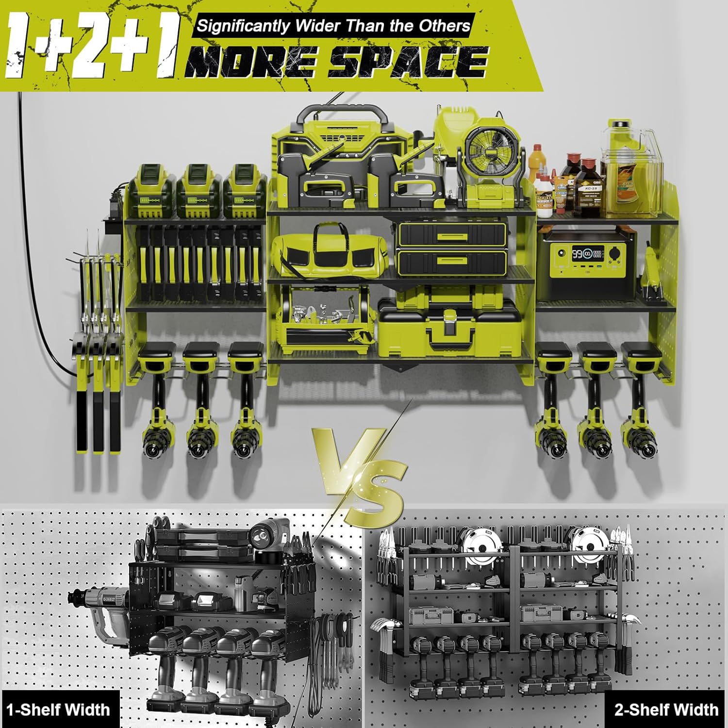 Power Tool Organizer Wall Mount with Charging Station, Expanded Width Tool Organizer for Garage Organization Max. 200lb Load, Heavy Duty Cordless Drill Holder with Outlet Power Strips
