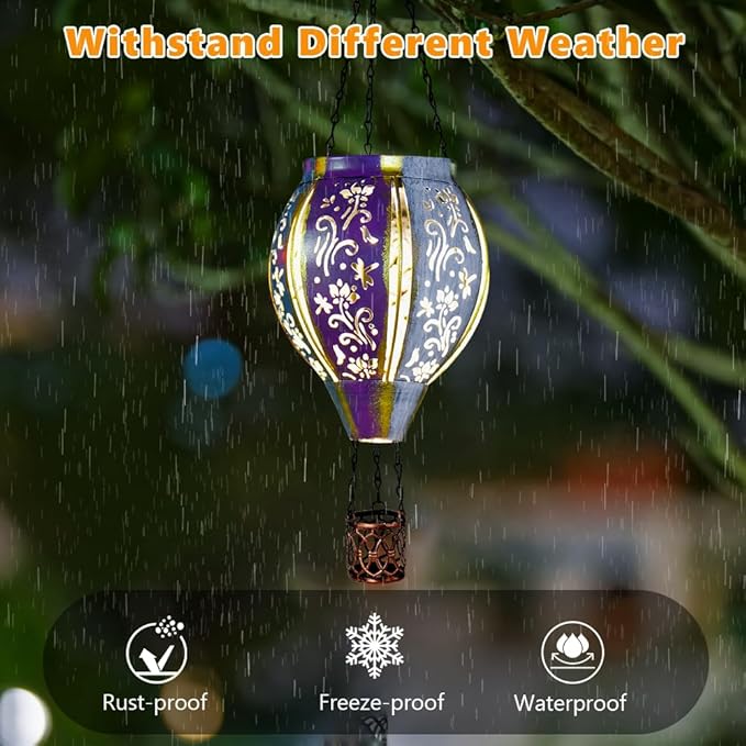 • 【Metal Hot Air Balloon Solar Lantern】The metalwork is not only decorative but also allows light to filter through, casting intricate shadows and creating a mesmerizing play of light and darkness in your garden or patio. This outdoor hanging solar lantern showcases intricate floral and swirl patterns, lending elegance and depth to its design.