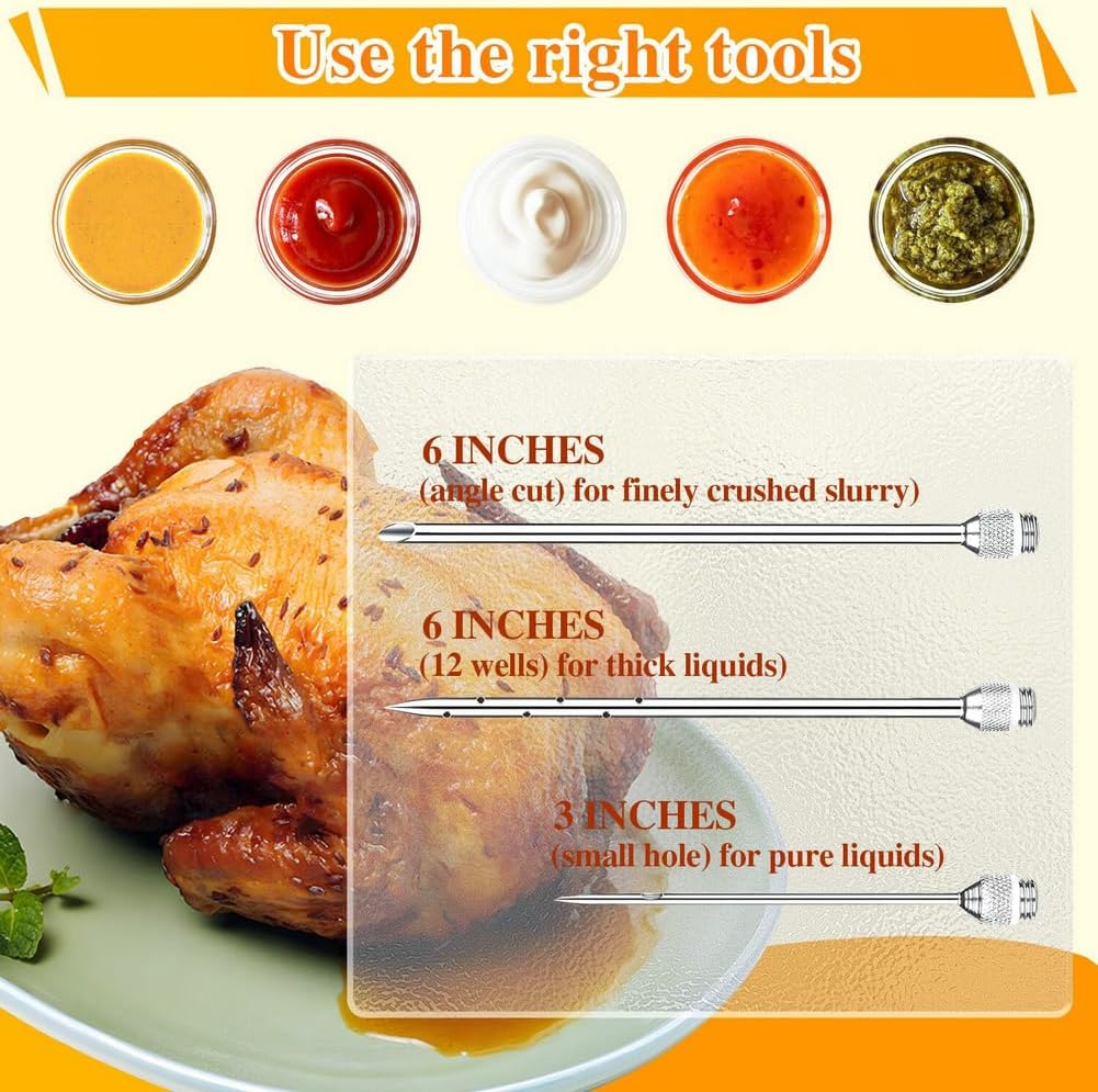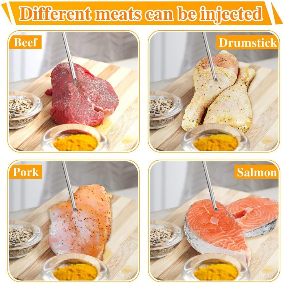 • Versatile Needle Options: This injector includes three specialized needles to suit all your seasoning needs: Side Hole Needle: Perfect for liquid marinades, allowing even distribution and deep penetration. Large End Hole Needle: Ideal for injecting minced garlic, onions, and other chunky ingredients. Short Needle: Designed for injecting smaller cuts like chicken, ensuring maximum flavor infusion.