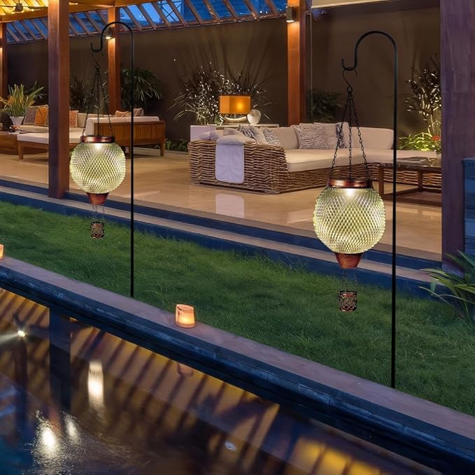 • 【Hot Air Balloon Solar Lantern】This outdoor hanging solar lanterns features a distinctive design with a metal mesh exterior that exudes a vintage charm. The cage shpe creates a delicate effect, allowing light to filter through and cast beautiful shadows.