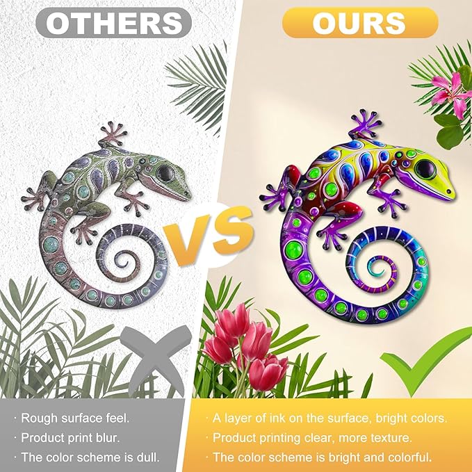 • Durable Metal Material: Metal gecko made of iron, after rust treatment, high-definition pattern printing. One layer of ink on the surface, bright colors. Durable, not afraid of the sun and rain, uneasy to fade, suitable for outdoor wall decoration