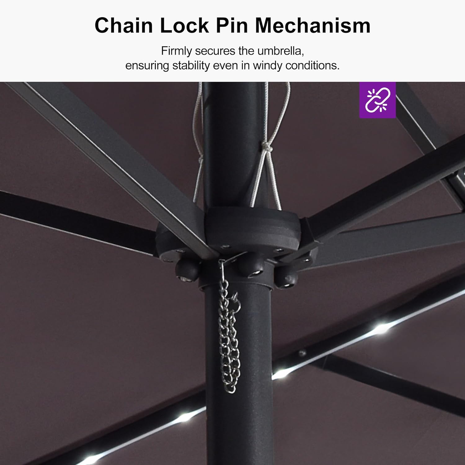 • Crank Design: The simple crank lifting system is equipped, enabling the convenient and rapid opening and closing of the patio umbrella. Additionally, an advanced chain lock pin is provided, ensuring the stability of the umbrella even in windy conditions