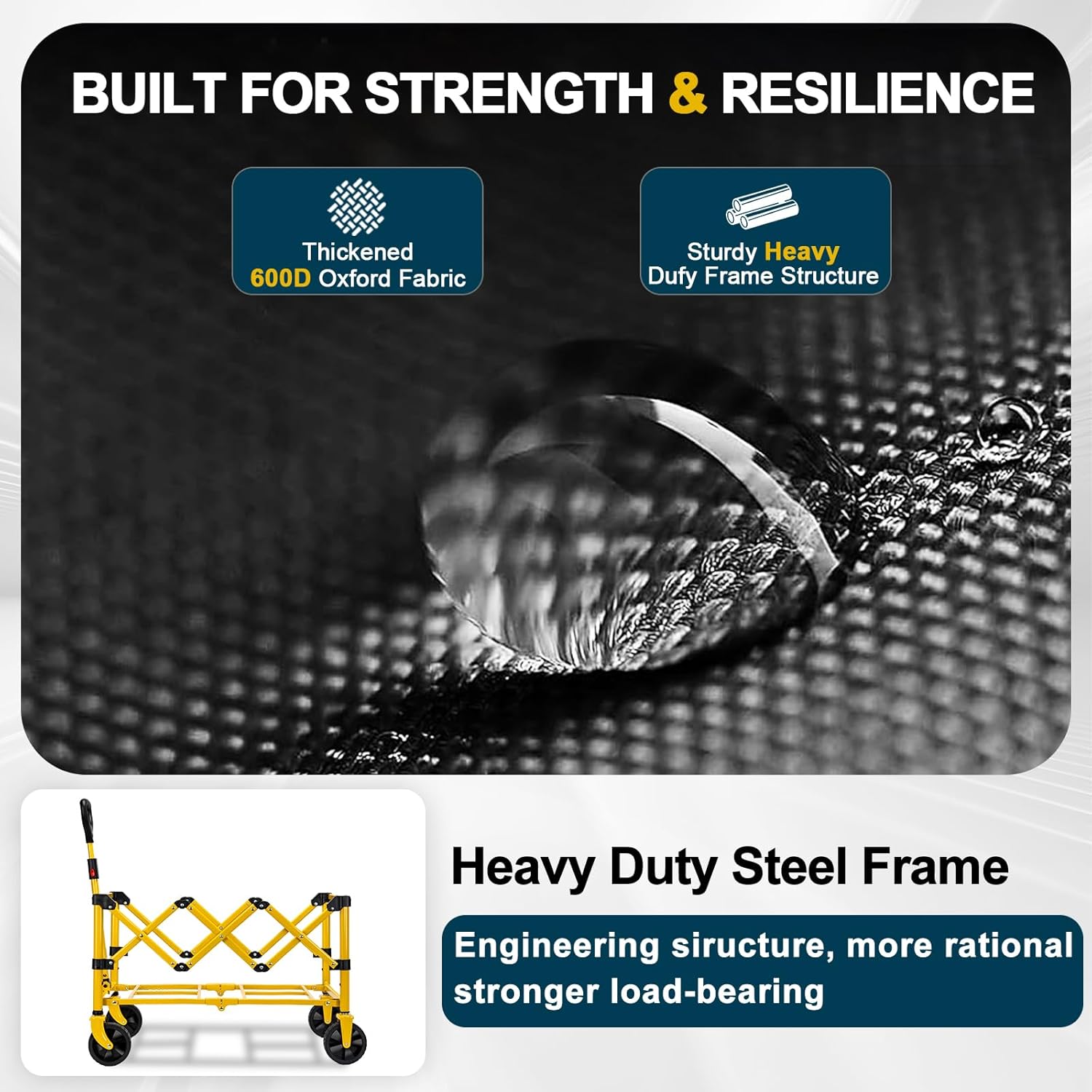 • LARGE CAPACITY - DURABLE COLLAPSIBLE WAGON: The collapsible wagon has an expansion size of 26.1"x 16.9"x 36.6" (L*W*H) and load up to 220LBS, which can carry all the goods your family needs for outdoor camping. The wagon body is made of lightweight aluminum alloy, compared to other products, our product is lightweight and strong, with anti-corrosion coating on the surface, which can prevent the body from rusting. Waterproof fabric, waterproof and durable, tear resistant, removable and washable