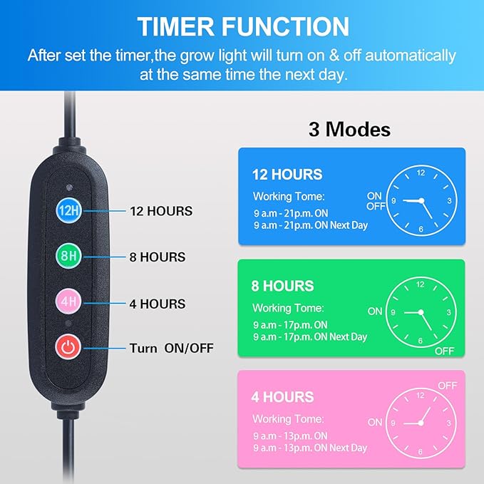 • Timer for Auto On/Off Plant Grow Light---4/8/12H Timer Grow Lights for Indoor Plants. Auto On/Off Every Day Just as You Need.