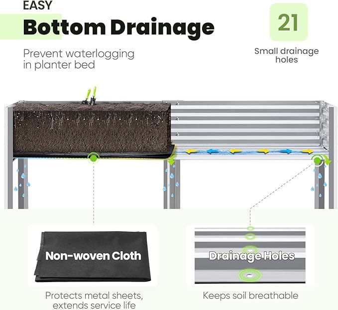 • 【Effortless Drainage】Ample drainage holes allow plant roots to breathe and drain properly. Comes with a non-woven fabric liner to ensure efficient drainage while containing soil, enabling worry-free indoor and outdoor use. The elevated garden bed is ideal for garden, backyard, balcony, and deck.