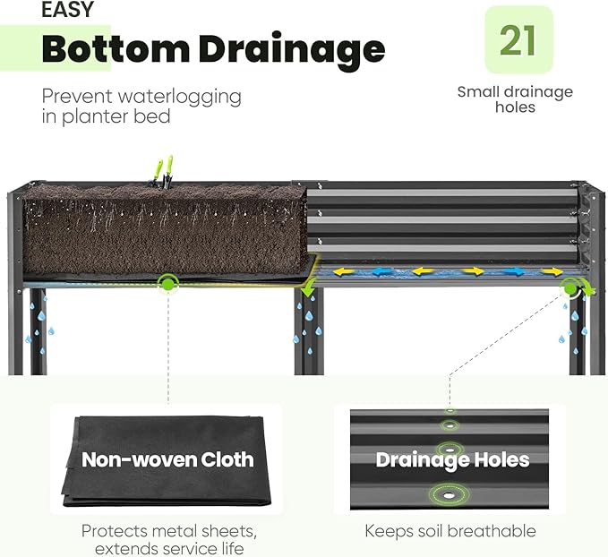• 【Effortless Drainage】Ample drainage holes allow plant roots to breathe and drain properly. Comes with a non-woven fabric liner to ensure efficient drainage while containing soil, enabling worry-free indoor and outdoor use. The elevated garden bed is ideal for garden, backyard, balcony, and deck.