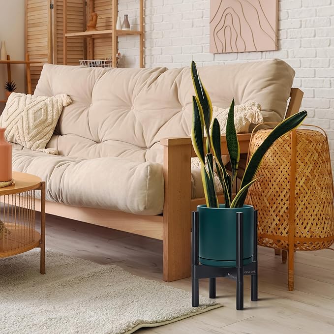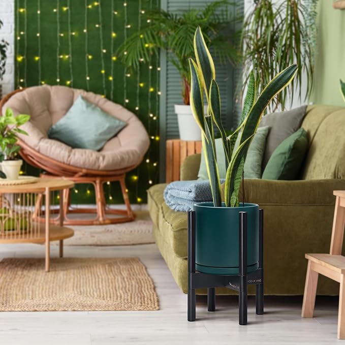 D'vine Dev Ceramic Planter with Ebony Stand - 8 Inch Modern Round Flower Pot with Wood Planter Holder, Teal, 55-B-M-4
