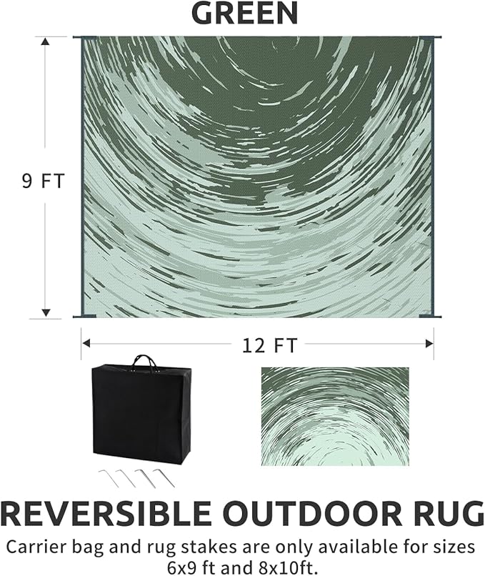 • RV traval&Camping: This camper must haves outdoor rug is ideal for picnics, gatherings, and RV trips! The lightweight outdoor camping carpet with foldable lines is easy to carry and saves space. Includes an extra carry bag and rug stakes for 6x9 ft, 8x10 ft and 9x12 ft. Grass-friendly, durable, and easy to clean, this outdoor rug enhances outdoor adventures.