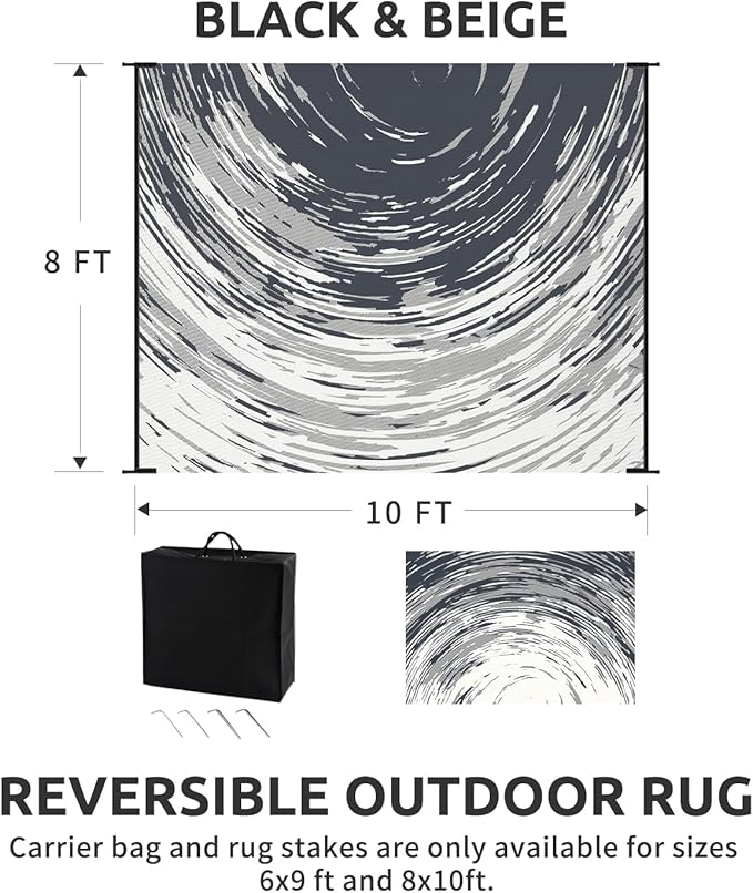• RV traval&Camping: This camper must haves outdoor rug is ideal for picnics, gatherings, and RV trips! The lightweight outdoor camping carpet with foldable lines is easy to carry and saves space. Includes an extra carry bag and rug stakes for 6x9 ft, 8x10 ft and 9x12 ft. Grass-friendly, durable, and easy to clean, this outdoor rug enhances outdoor adventures.