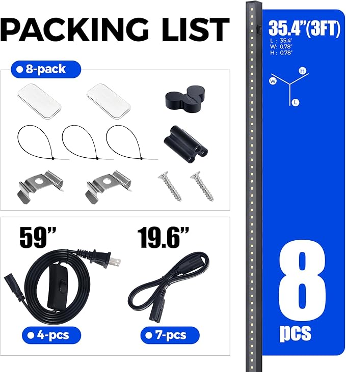 • What You Get: 8 x Barrina T5 Grow Lights, 4 x Power Cords with ON/OFF Switch, 7 x Connecting Cords (20''), 8 x Small Connectors, 16 x Installation Clips, 16 x Magnetic Bars with Double-Sided Tape, 24 x Cable Ties, 8 x Dustproof Cap