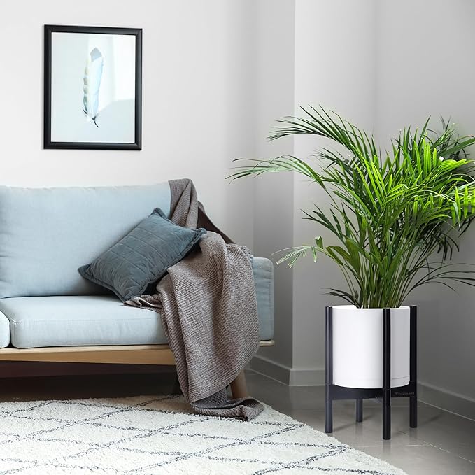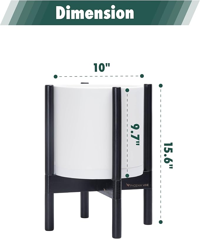• A Complete Set: Minimalist plastic planter, combined with a sculptural, solid wood stand that match perfectly together and looks great in any home.