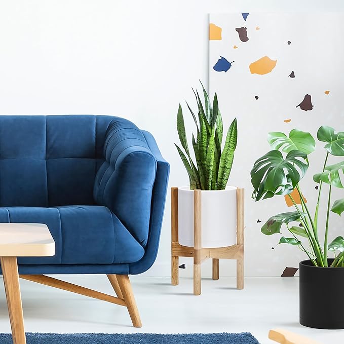 • A Complete Set: Minimalist plastic planter, combined with a sculptural, solid wood stand that match perfectly together and looks great in any home.